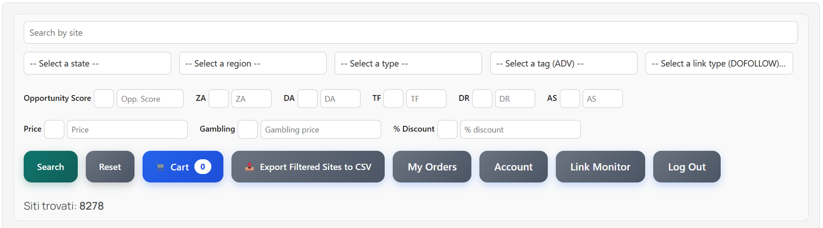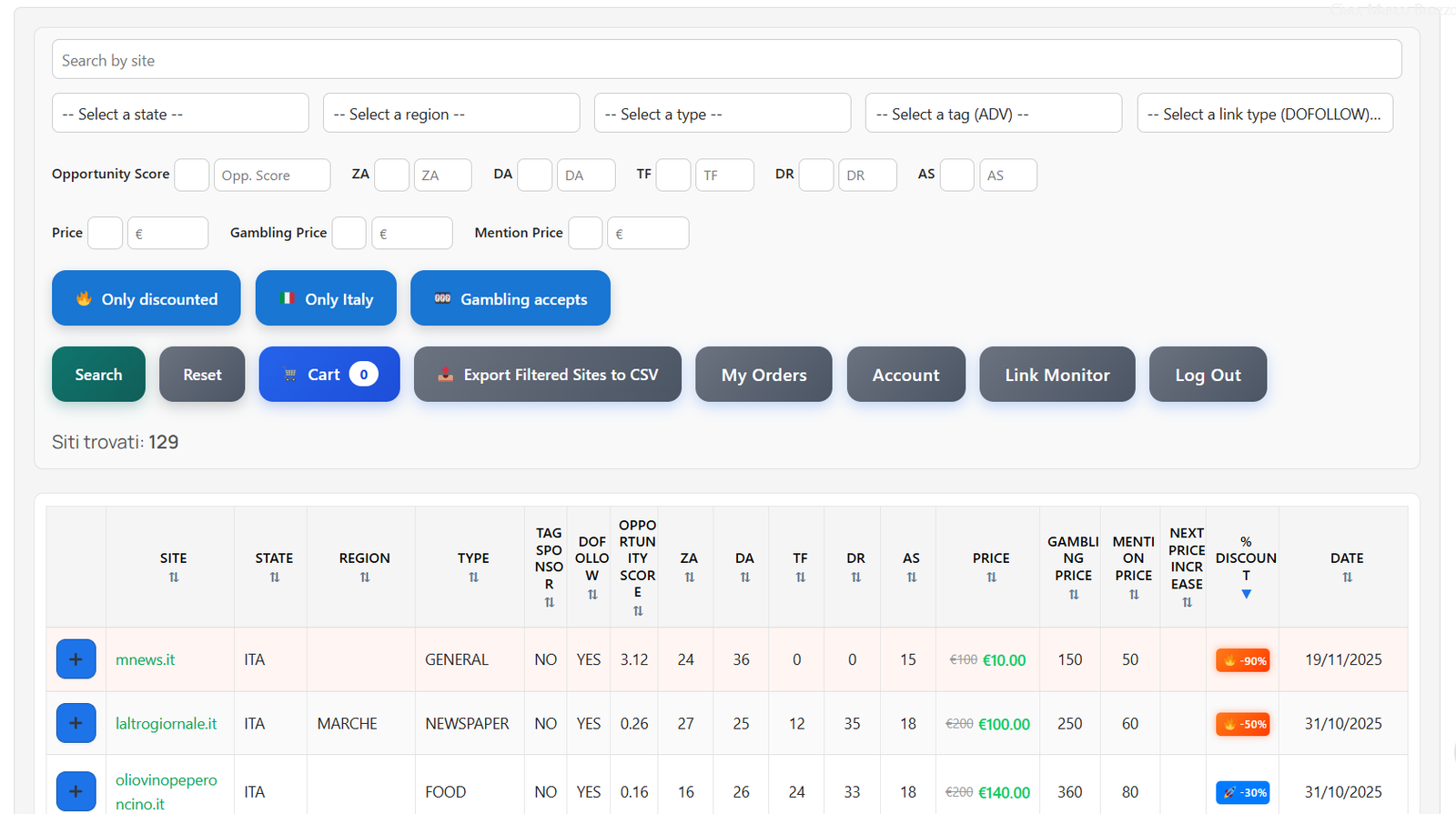 Il nostro gestionale ti permette di consultare un database di siti con metriche dettagliate e aggiornate. Puoi filtrare per SEO score, authority, prezzo, tipologia di link, settore e altri parametri fondamentali. Questo ti consente di selezionare in autonomia le opportunità più adatte al tuo progetto, mantenendo pieno controllo su budget e strategia.